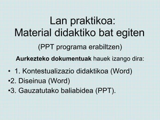 Lan praktikoa: Materialdidaktiko bat egiten (PPT programa erabiltzen) Aurkezteko dokumentuak hauek izango dira: 1. Kontestualizazio didaktikoa (Word) 2. Diseinua (Word) 3. Gauzatutako baliabidea (PPT).