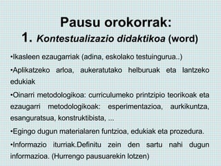 Pausu orokorrak: 1. Kontestualizazio didaktikoa (word) Ikasleen ezaugarriak (adina, eskolako testuingurua..) Aplikatzeko arloa, aukeratutako helburuak eta lantzeko edukiak Oinarri metodologikoa: curriculumeko printzipio teorikoak eta ezaugarri metodologikoak: esperimentazioa, aurkikuntza, esanguratsua, konstruktibista, ... Egingo dugun materialaren funtzioa, edukiak eta prozedura. Informazio iturriak.Definitu zein den sartu nahi dugun informazioa. (Hurrengo pausuarekin lotzen)