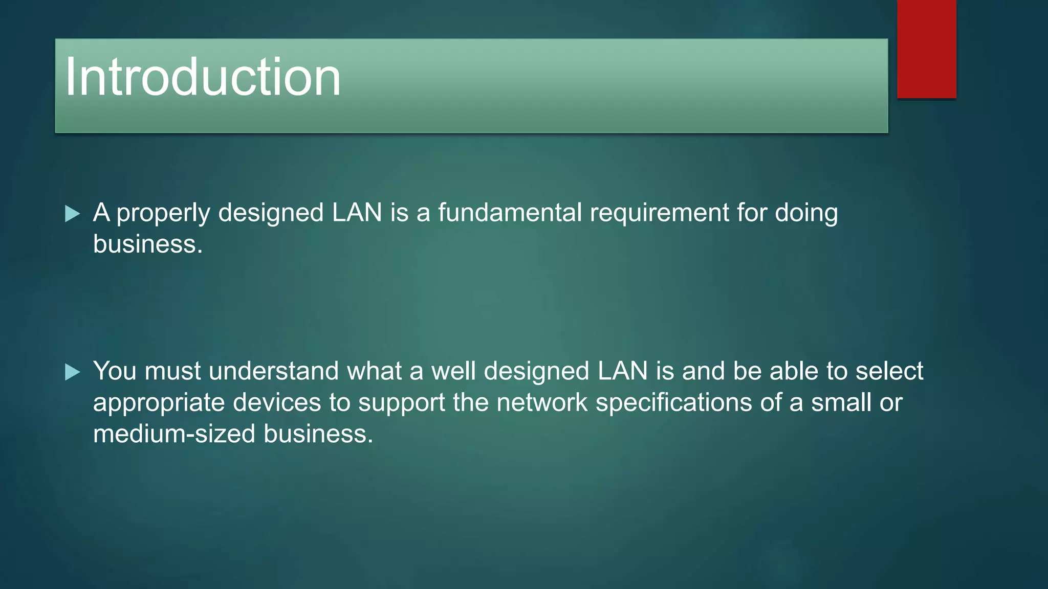 Introduction  A properlydesigned LAN is a fundamental requirement for doing business.  You must understand what a well designed LAN is and be able to select appropriate devices to support the network specifications of a small or medium-sized business.