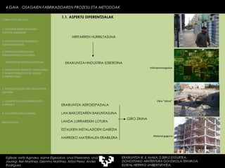 HIRITARREN HURBILTASUNA ERAIKUNTZA=INDUSTRIAEZBERDINA mikroprozesagailua 4.GAIA OSAGAIEN FABRIKAZIOAREN PROZESU ETA METODOAK Egileak: Ioritz Aginako, Izarne Elgezabal, Unai Etxebarria, Unai Jauregi, Iker Martínez, Gemma Martínez, Aitzol Perez, Ander Rodriguez 4.GAIA OSAGAIEN FABRIKAZIOAREN PROZESU ETA METODOAK Egileak: Ioritz Aginako, Izarne Elgezabal, Unai Etxebarria, Unai Jauregi, Iker Martínez, Gemma Martínez, Aitzol Perez, Ander Rodriguez 1.1. ASPEKTU DIFERENTZIALAK 2. GARAPEN INDUSTRIALAREN FAKTORE KLASIKOAK 3. KONPOSAGAIEN PRODUKZIO SISTEMA BASIKOAK 4. PRODUKZIO PROZESUEN ERRENDIMENDU ERLATIBOA 1. ERAIKUNTZA PROZESU TRADIZIONAL ETA INDUSTRIALIZATUEN ANALISI KONPARATIBOA 3. ELEMENTU AURREFABRIKATUEN GARRAIOA 4. LAGUNTZA BIDEAK OBRAN ERAIKUNTZA MUNTAIA MODURA 2. PROZESU HEZEAK EDO ERAIKUNTZA LEHORRA BIBLIOGRAFIA 1.OBRA ETA LANTEGIA ERAIKUNTZA AEROESPAZIALA LAN BAKOITZAREN BAKUNTASUNA LANDA LURRAREKIN LOTURA ESTALKIEN INSTALAZIOEN GABEZIA HARRIZKO MATERIALEN ERABILERA GIRO ZIKINA Obra ”zikina” Material gogorra