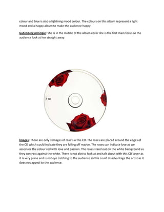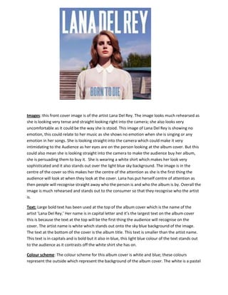 The front cover image shows Lana Del Rey looking tense and uncomfortable while staring directly into the camera. She shows no emotion, which relates to her music. Her central positioning and direct eye contact make her the focus of attention and could intimidate or persuade viewers to buy the album. Large bold text at the top displays her name to identify the artist. Smaller blue text at the bottom lists the album title. The color scheme of white and light blue create a calm, happy mood. On the back cover, capitalized text lists track information in black on a red background. Red roses around the edges may symbolize love falling away.