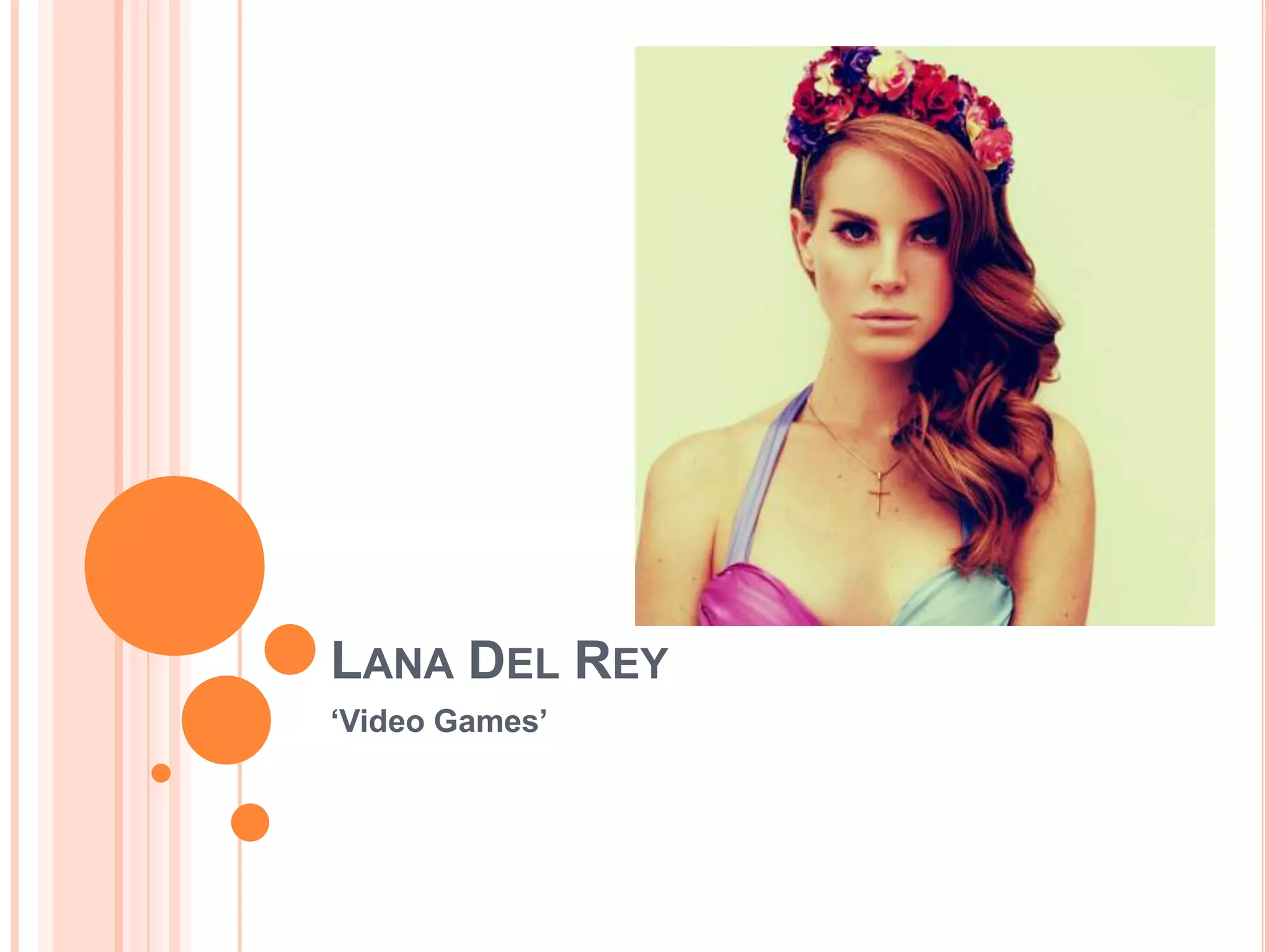 Lana Del Rey's 2011 music video for "Video Games" features footage she filmed herself on a webcam. The video has a home movie aesthetic and portrays Del Rey with a neutral expression, emphasizing her emotions through lyrics and close-ups. While some shots directly relate to lyrics, many use intertextual references without direct connections. Del Rey aims to seem relatable rather than extravagant. The video establishes her star image through focus on her appearance against simple backdrops and references to fame, while also portraying her in a sexualized manner through flirtatious body language and interactions with the camera.