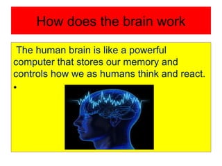 The human brain works like a powerful computer, storing memory and controlling how humans think and react. It contains different parts like the parietal lobe, occipital lobe, frontal lobe, temporal cortex, cranium, basal brain stem, cerebellum, and dura that send and receive information around the body using billions of nerve cells. The human brain is also over three times as big as other mammals of similar body size.