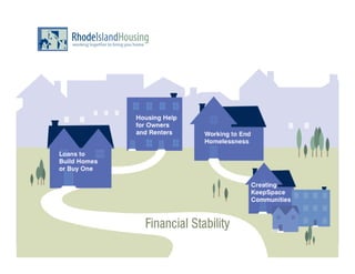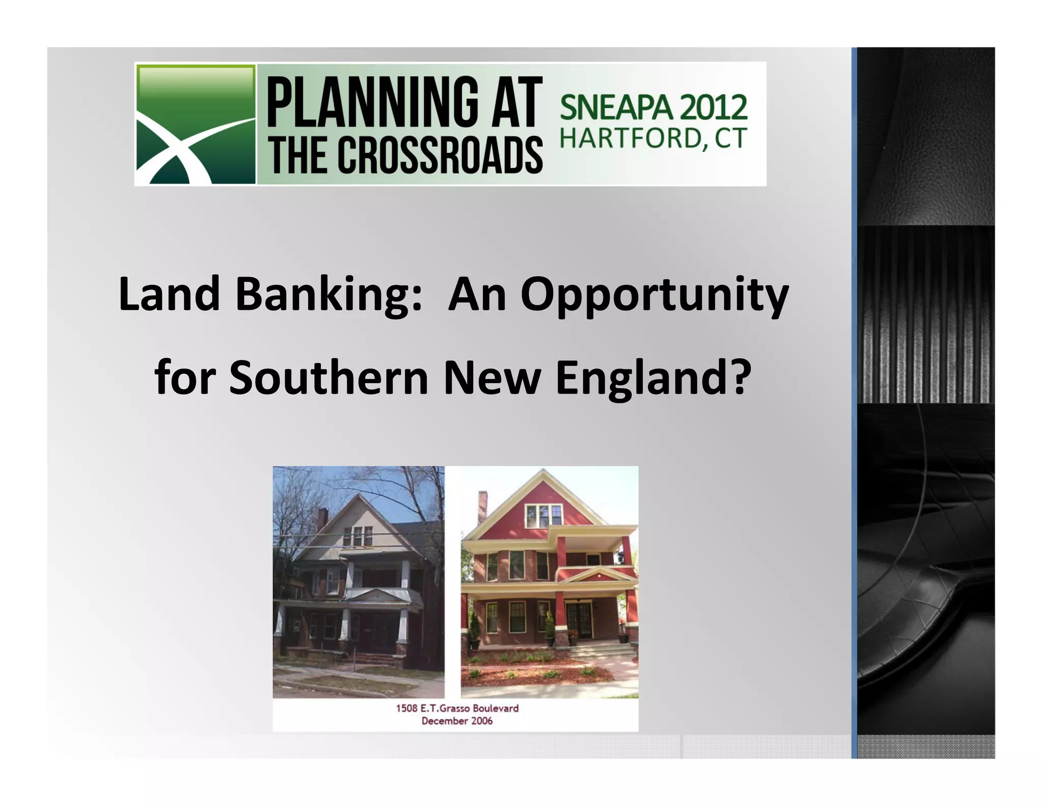 Land banks acquire distressed properties and hold them for future use or resale. They typically get properties through tax foreclosure, mortgage foreclosure, donations, or market transfers. Two successful land banks are highlighted - the Genesee County Land Bank Authority in Michigan and the Cuyahoga County Land Reutilization Corp. in Ohio. Rhode Island Housing also runs a land bank program that acquires properties and transfers them to developers to produce long-term affordable housing. The program has invested over $44 million since 2000, with purchases ranging from urban apartment buildings to rural land parcels.