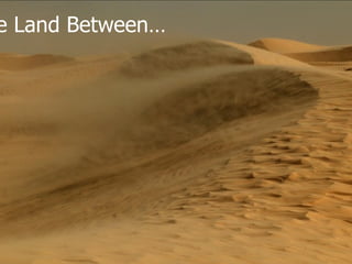 The document discusses "the land between" as a place God uses to teach people to trust Him through crisis. It states that during times of crisis, how one responds reveals their character and foreshadows who they will become. It encourages developing habits of trusting God rather than complaining when in difficult periods, as complaint shows a lack of trust, while trusting God's wisdom and love can lead to spiritual transformation during life's in-between times.