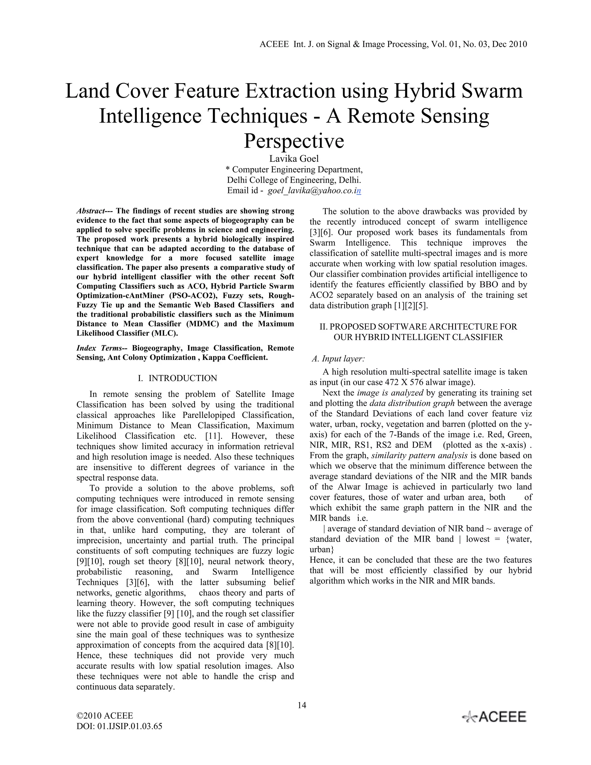 This document presents a hybrid algorithm using biogeography-based optimization (BBO) and ant colony optimization (ACO) for land cover feature extraction from remote sensing images. The algorithm first analyzes a training image to identify features that BBO and ACO classify efficiently. It then applies BBO to clusters containing these features and ACO to remaining clusters. An evaluation shows the hybrid algorithm achieves a higher kappa coefficient of 0.97 compared to 0.67 for BBO alone, indicating better classification accuracy. The authors conclude the algorithm effectively handles uncertainties in remote sensing images and future work could improve efficiency further.