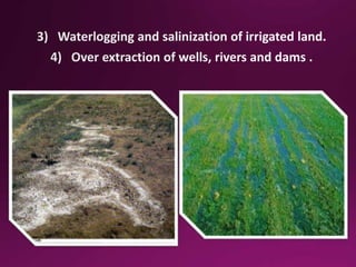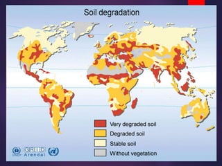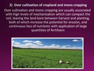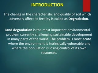 Land degradation refers to the reduction in soil quality and fertility due to various human and environmental factors. It is a major challenge for sustainable development. The causes of land degradation include deforestation, soil erosion, mining, unsustainable agricultural practices, and urban expansion. These activities can lead to declines in soil quality, water availability, biodiversity, and agricultural productivity. Conservation measures to prevent land degradation involve practices like strip farming, crop rotation, contour farming, and construction of bunds and ridges to reduce soil erosion. Sustainable land management aims to utilize land resources for production without reducing long-term productivity through practices informed by climate information.