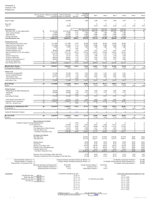 This document summarizes the financial projections for a 55-home community across 6 development plans. Total projected revenues are over $16 million with a 24.9% housing direct margin. After indirect costs, the projected gross margin is 20.2%. Expected profit contribution is 14.6% of total revenues, or over $2.3 million. Absorption of homes is projected at 6.1 per month on average over a 9 month delivery period.