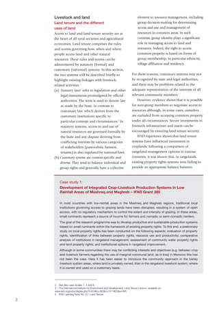 The document discusses the critical role of equitable and secure access to land for rural poor livestock owners, emphasizing its importance in reducing vulnerability and fostering sustainable livestock development. It highlights various case studies from IFAD projects in Africa that address challenges related to land access, water management, and land degradation, while showcasing community-based approaches to improve livestock and crop production systems. The paper advocates for integrated development strategies that balance the needs of both crop farmers and livestock breeders to enhance food security and sustainable resource management.