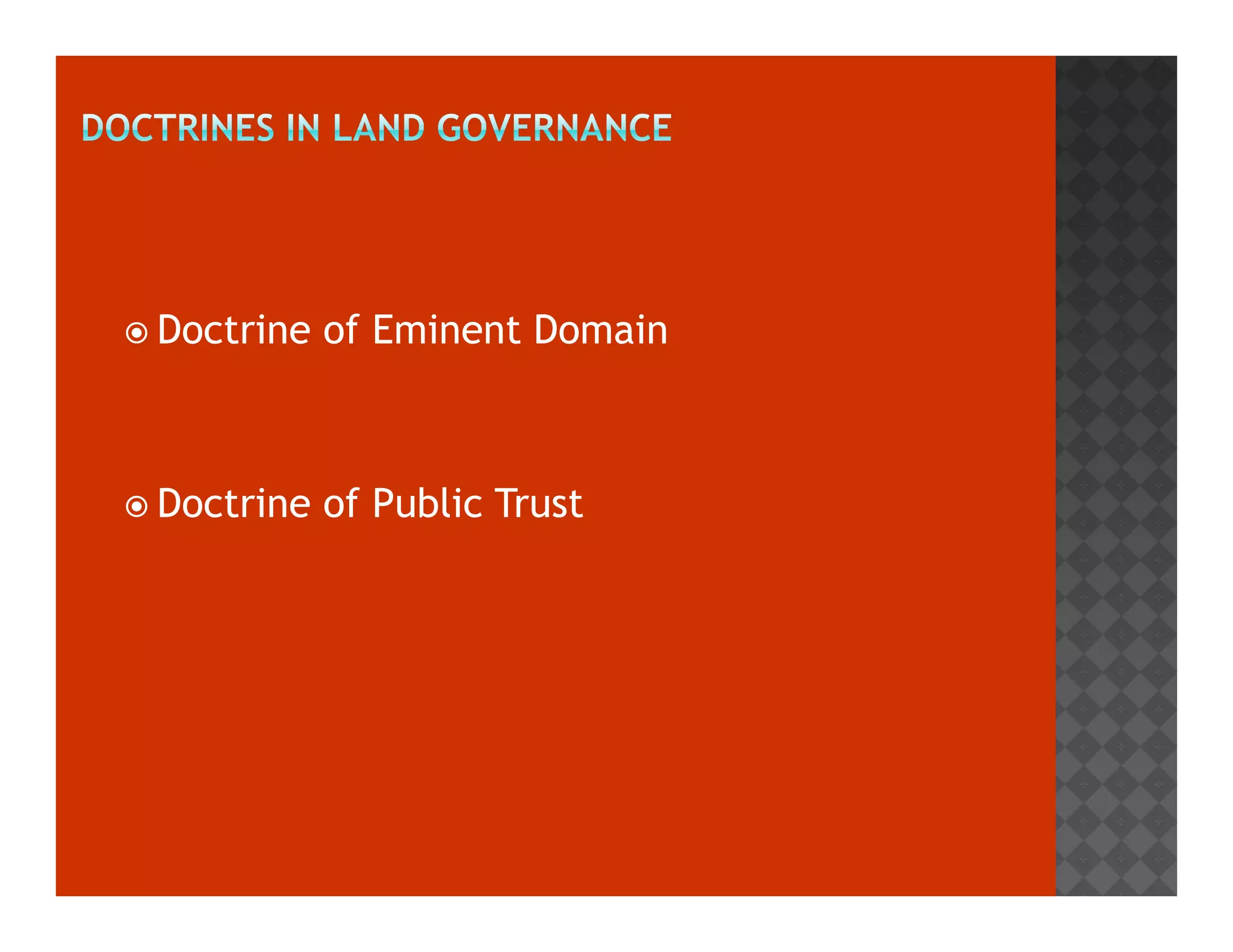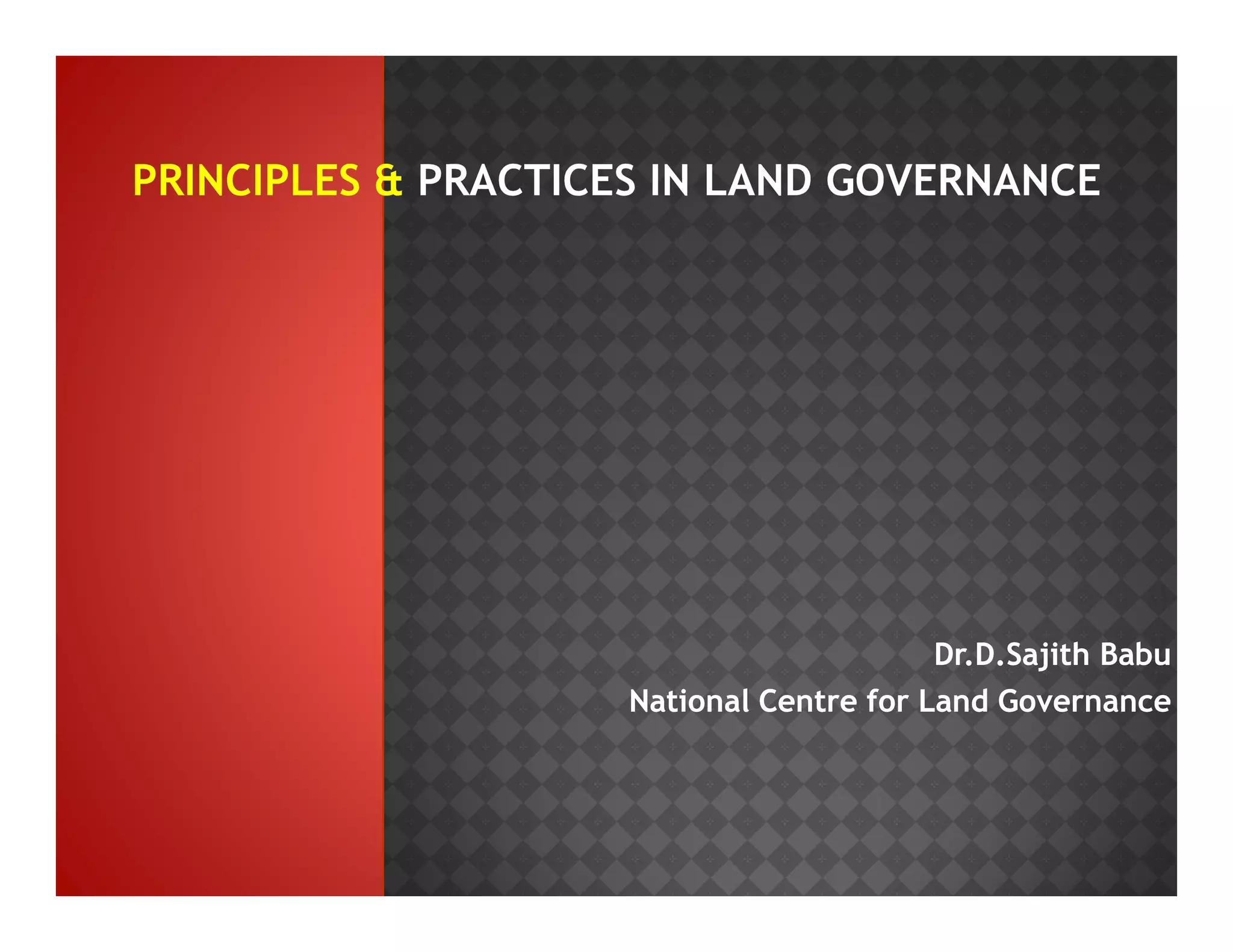 This document discusses land governance in India. It outlines the doctrines of eminent domain and public trust that form the basis of land ownership. Eminent domain holds that all land ultimately belongs to the sovereign, while public trust says the government should act as trustee of natural resources. The document then categorizes different types of government-owned lands in India, such as lands belonging to government departments, religious institutions, public sector undertakings, and local governments. It discusses the legal frameworks around land survey, registration, and transfer. Finally, it addresses issues like establishing centralized land records, preventing encroachment, and enhancing land management and value.