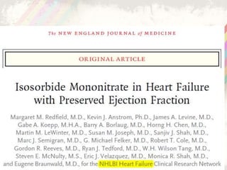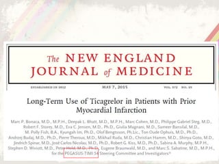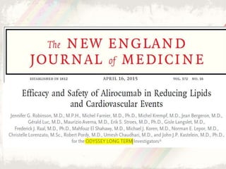 The document summarizes several landmark clinical trials from 2015 related to cardiovascular diseases. It discusses the SPRINT trial which compared intensive vs standard blood pressure control and found lower rates of cardiovascular events with intensive control below 120 mm Hg. It also summarizes the IMPROVE-IT trial which found adding ezetimibe to statin therapy after acute coronary syndrome further lowered cardiovascular risks. The MATRIX program evaluated bivalirudin vs heparin in PCI and found no significant difference in outcomes. The AMBITION trial found initial combination therapy with ambrisentan and tadalafil lowered risks compared to monotherapy in pulmonary arterial hypertension.
