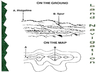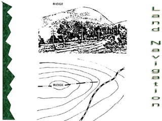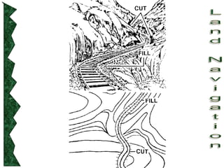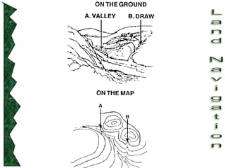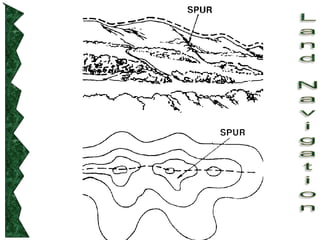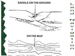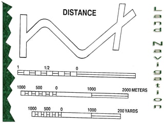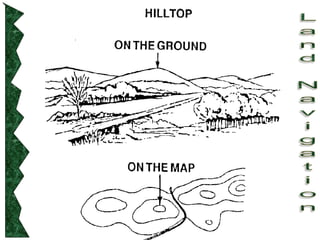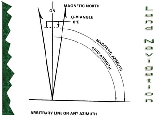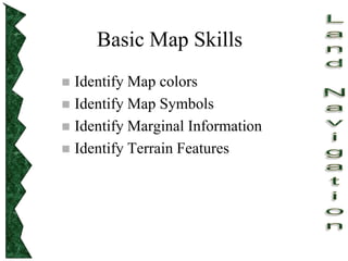 The document outlines basic map reading skills necessary for land navigation, including identifying map colors, symbols, marginal information, and terrain features. It explains how to determine grid and elevation, as well as how to calculate azimuths and distances using various methods. The content includes practical exercises to strengthen understanding of these navigation techniques.