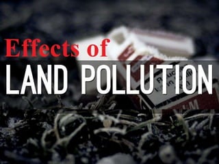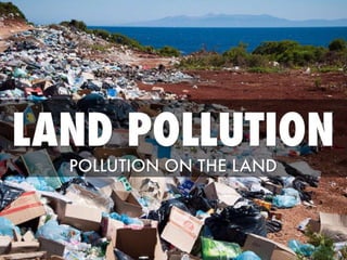 Land pollution refers to the degradation of the earth's surfaces due to human activities, such as deforestation and inefficient land use, leading to issues like desertification and soil pollution. This has adverse effects on climate, such as reduced rainfall and increased greenhouse gases, resulting in global warming and acid rain. Solutions include promoting organic farming, effective waste management, recycling, and tree planting to enhance soil fertility and reduce pollution.