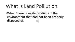 Land pollution occurs when waste products are improperly disposed of in the environment from sources like agriculture, overcrowded landfills, industrialization, and construction. It can be prevented by reducing waste through reusing and recycling, using less pesticides, properly disposing of garbage, and choosing biodegradable products.