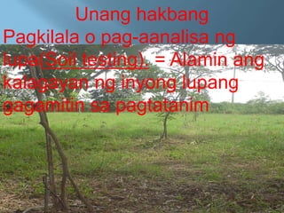 Ang dokumento ay naglalahad ng mga hakbang sa paghahanda ng lupang pagtataniman, na nagsisimula sa pagsusuri at pag-aayos ng lupa para sa masaganang ani. Kabilang dito ang pagkilala sa uri at katangian ng lupa, paglilinis ng lugar, pagbubungkal, at paggawa ng kamang taniman, pati na rin ang sterilization at pagpapabunga ng lupa. Dagdag pa rito, tinatalakay ang kahalagahan ng mulching at mga paraan upang mapanatili ang kalusugan ng lupa.