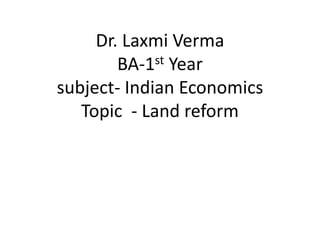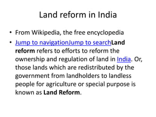 Land reform in India has involved abolishing intermediaries like rent collectors and establishing ceilings on land ownership to redistribute surplus land to the landless. The goals were to remove impediments to agricultural production from the previous feudal system and eliminate exploitation. Key reforms included abolishing rent collectors, regulating tenancy, imposing landholding ceilings, consolidating fragmented holdings, and promoting cooperative farming. Impacts included reducing disparities, giving ex-landlords other work, increasing revenue, and empowering small farmers and laborers. Land reform aimed to promote social justice and economic growth through a more equitable distribution of agricultural land.