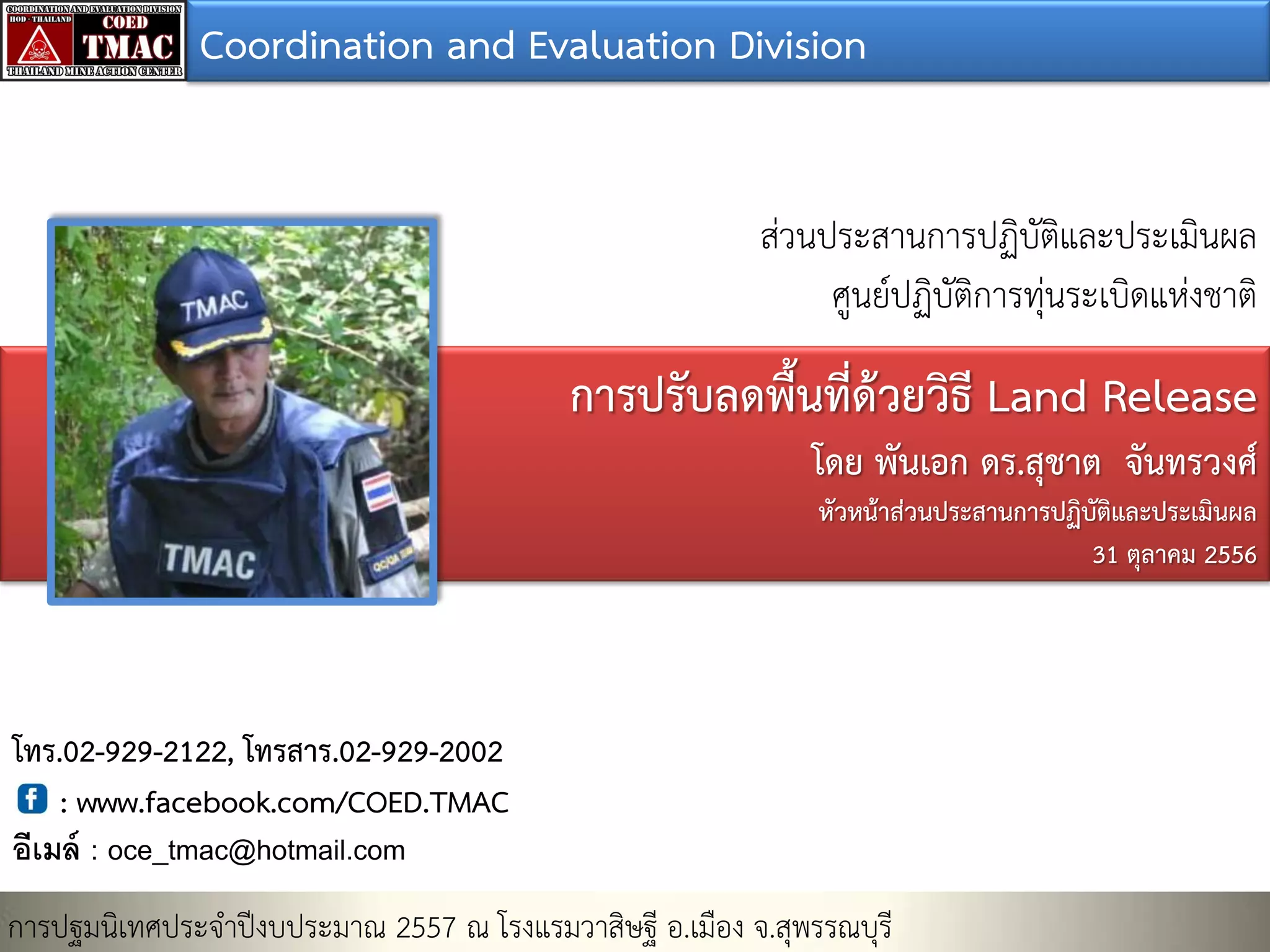 Division ส่วนประสานการปฏิบัติและประเมินผล ศูนย์ปฏิบัติการทุ่นระเบิดแห่งชาติ การปรับลดพื้นที่ด้วยวิธี Land Release โดย พันเอก ดร.สุชาต จันทรวงศ์ หัวหน้าส่วนประสานการปฏิบัติและประเมินผล 31 ตุลาคม 2556 โทร.02-929-2122, โทรสาร.02-929-2002 : www.facebook.com/COED.TMAC อีเมล์ : oce_tmac@hotmail.com การปฐมนิเทศประจาปีงบประมาณ 2557 ณ โรงแรมวาสิษฐี อ.เมือง จ.สุพรรณบุรี