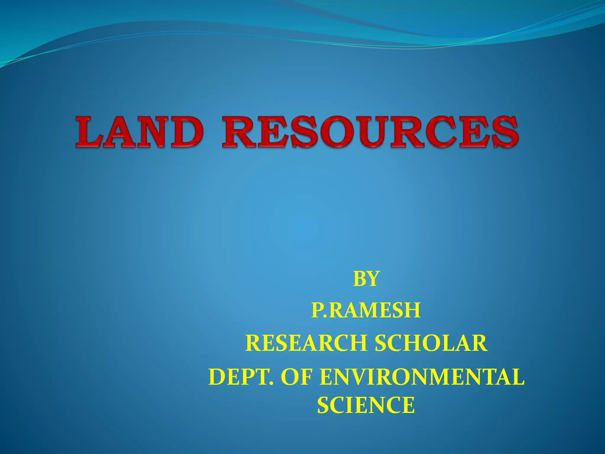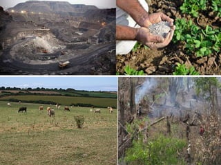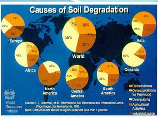 The document discusses the significance of land as a vital natural resource for human society, detailing its uses in agriculture, mineral extraction, and habitat provision. It identifies causes of land degradation, both natural and anthropogenic, including deforestation and urbanization, and explains soil erosion as the wearing away of topsoil by wind and water. Additionally, it describes various soil conservation techniques like no-till farming, mulching, and contour farming aimed at mitigating these issues.