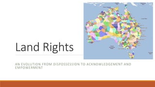 The document outlines the historical evolution of land rights in Australia, detailing the transition from the dispossession of Indigenous peoples to a gradual recognition and empowerment of their land claims. It highlights significant events including colonization under 'terra nullius,' the Mabo decision which rejected this doctrine, and subsequent policies like the Native Title Act that aimed to address historical injustices. The document also emphasizes the importance of Indigenous land rights for cultural, economic, and environmental sustainability.