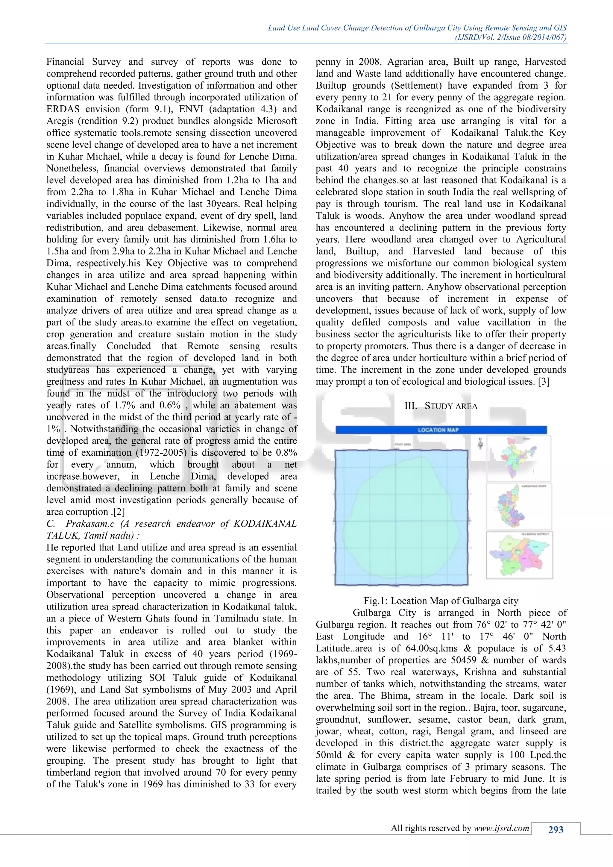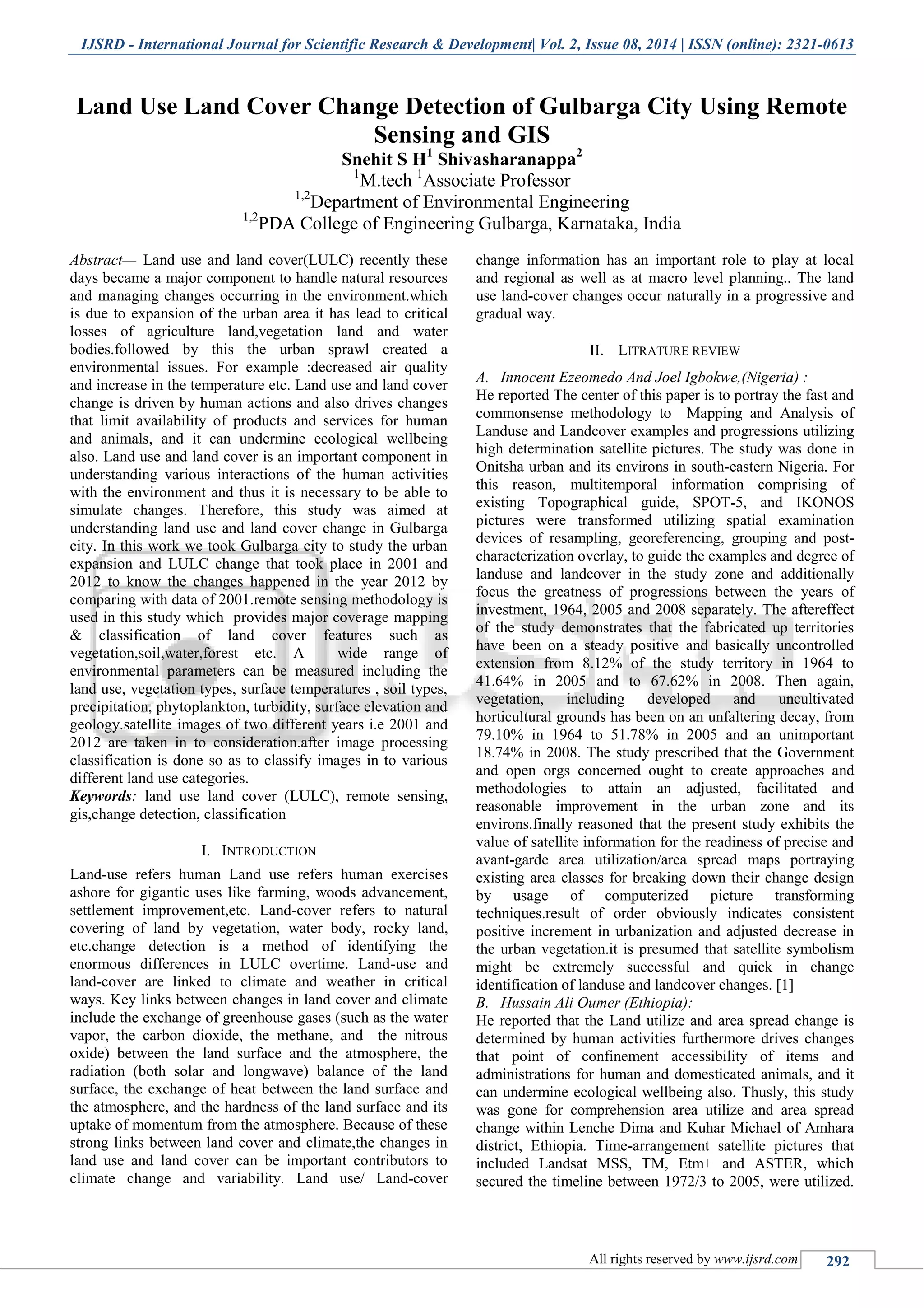 This document summarizes a study that analyzed land use and land cover change in Gulbarga City, India between 2001 and 2012 using remote sensing and GIS techniques. Satellite images from 2001 and 2012 were classified to identify changes in land cover categories such as vegetation, soil, water, and forest area. The study found expansion of urban areas led to losses of agricultural land, vegetation land, and water bodies. This urban sprawl also created environmental issues like decreased air quality and increased temperatures. The goal of the study was to understand land use and land cover change in Gulbarga City and quantify changes that occurred between 2001 and 2012 by comparing satellite image data from the two time periods.