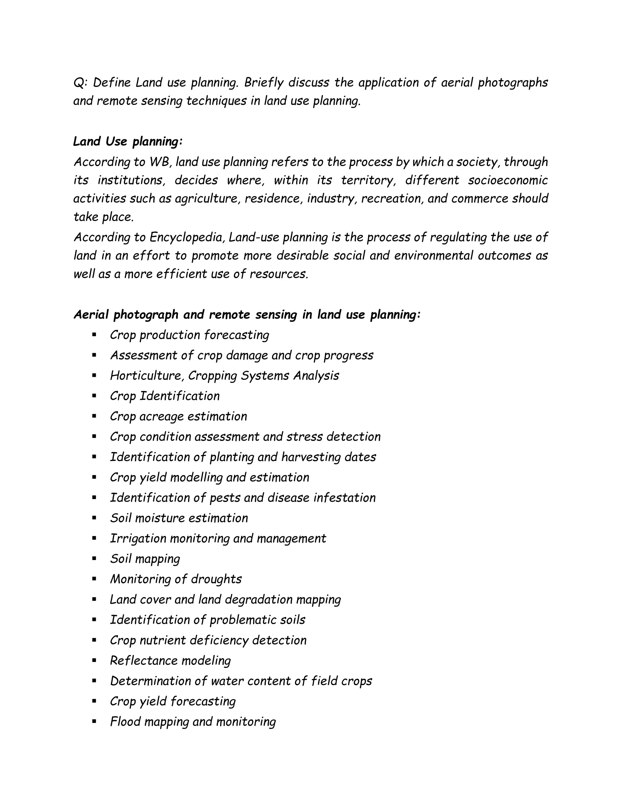 Land use planning refers to the process by which a society decides where different socioeconomic activities such as agriculture, residence, industry, and commerce should take place within its territory. Aerial photographs and remote sensing techniques are applied in land use planning for various purposes such as crop production forecasting, land cover and land degradation mapping, soil mapping, and precision farming.