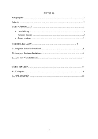 Makalah ini membahas tentang landasan pendidikan yang merupakan dasar operasionalisasi sistem pendidikan, mencakup jenis-jenisnya seperti landasan filosofis, sosiologis, psikologis, kultural, ilmiah, religius, dan yuridis. Selain itu, dibahas juga asas-asas pokok pendidikan di Indonesia serta pentingnya peran guru dalam proses mengajar dan mendidik untuk mencapai tujuan pendidikan. Kesimpulannya, pendidikan harus mempertimbangkan berbagai landasan dan asas sebagai acuan dalam merancang dan melaksanakan pendidikan.