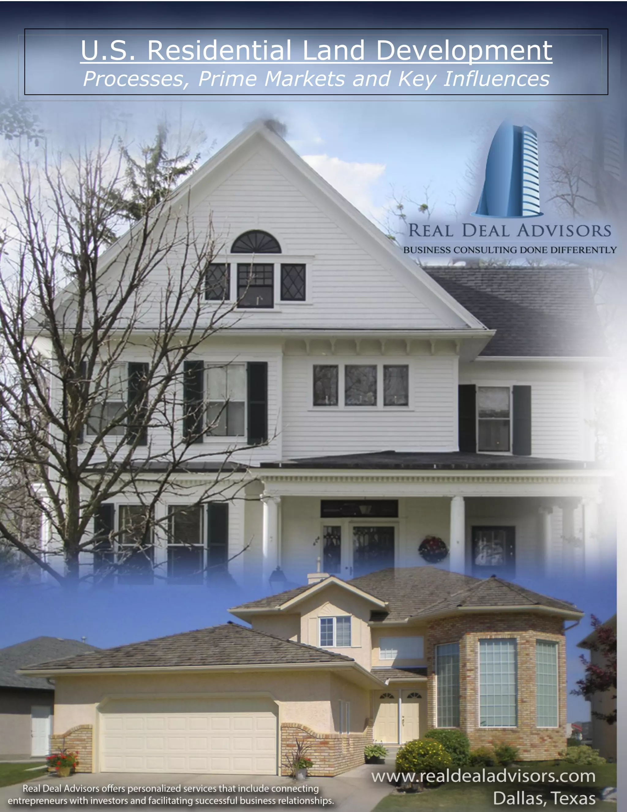 This document discusses residential land development in the United States. It examines the process of land development, from researching potential markets to securing approvals. The top markets for development are identified as San Francisco, Houston, San Jose, New York City, and Dallas/Fort Worth based on factors like job and population growth. Unemployment rates, economic health, and preferences for urban living are cited as the biggest influences on development trends. Developers are advised to thoroughly research markets, have a strong plan and team, and build relationships.