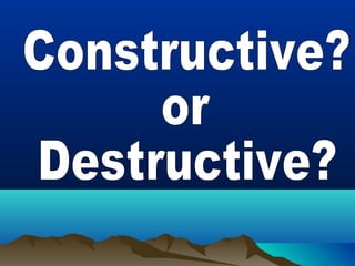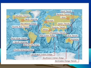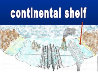 Natural processes like weathering, erosion, deposition, landslides, volcanic eruptions, earthquakes and floods shape Earth's landforms and oceans in both constructive and destructive ways. Key ocean landforms include the continental shelf, slope, mid-ocean ridge, rift zone, trench, and ocean basin. Waves, currents, tides and storms continually change coastal features such as beaches, barrier islands, estuaries and inlets through erosion and deposition.