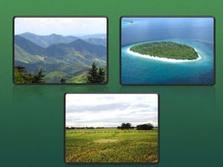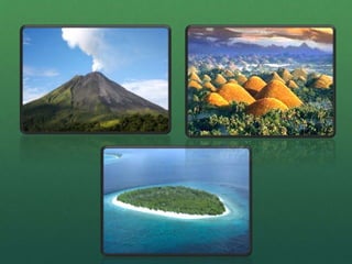 This document defines and describes different types of landforms including plains, plateaus, valleys, mountains, hills, mountain ranges, volcanoes, islands, and peninsulas. Plains are wide, flat areas of low land while plateaus are flat high lands. Valleys are low areas surrounded by hills or mountains. Mountains are steep high lands and hills are lower and smoother high lands. Mountain ranges are rows of connected mountains. Volcanoes are mountains with craters that erupt. Islands are areas of land surrounded by water and peninsulas extend out from land into water but are not completely surrounded.