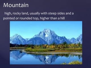 This document defines and describes various types of landforms and regions. It discusses mountains such as fault mountains and fold mountains that are formed by tectonic plate movement. It also covers plains, grasslands, deserts, forests, wetlands and bodies of water including rivers, lakes, seas and oceans. Regions described include prairies, savannas, tundra, and different forest biomes.
