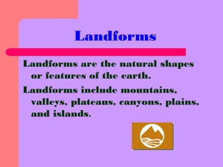 Landforms include mountains, valleys, plateaus, canyons, plains, and islands. Mountains are the highest form of land with peaks, valleys are lowlands between mountains, and plateaus are flat areas higher than the surrounding land. Canyons are deep valleys with steep sides. Bodies of water consist of oceans, rivers, and lakes, with oceans being the largest bodies of water on Earth, rivers being long flowing bodies of water, and lakes being bodies of water surrounded by land.