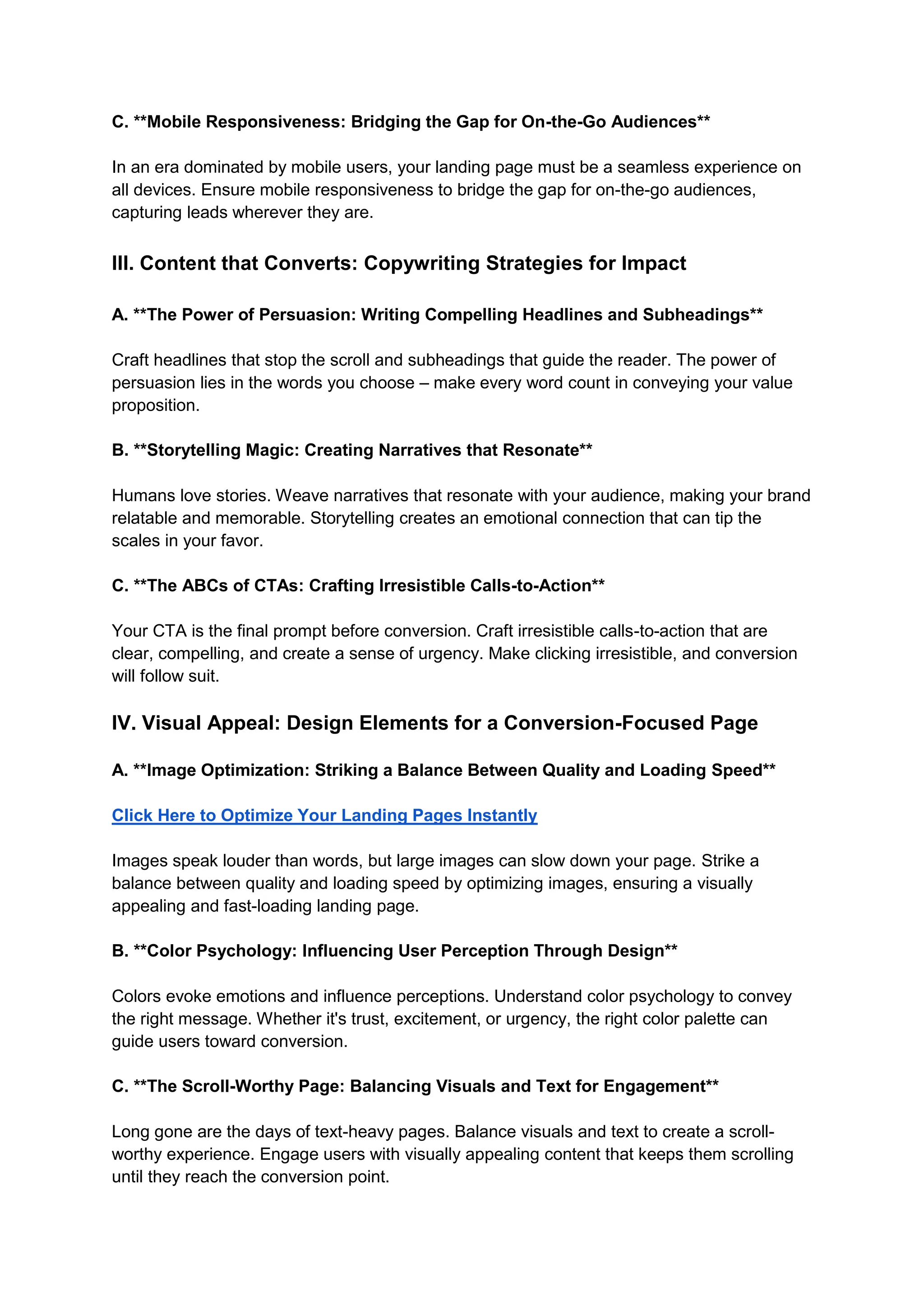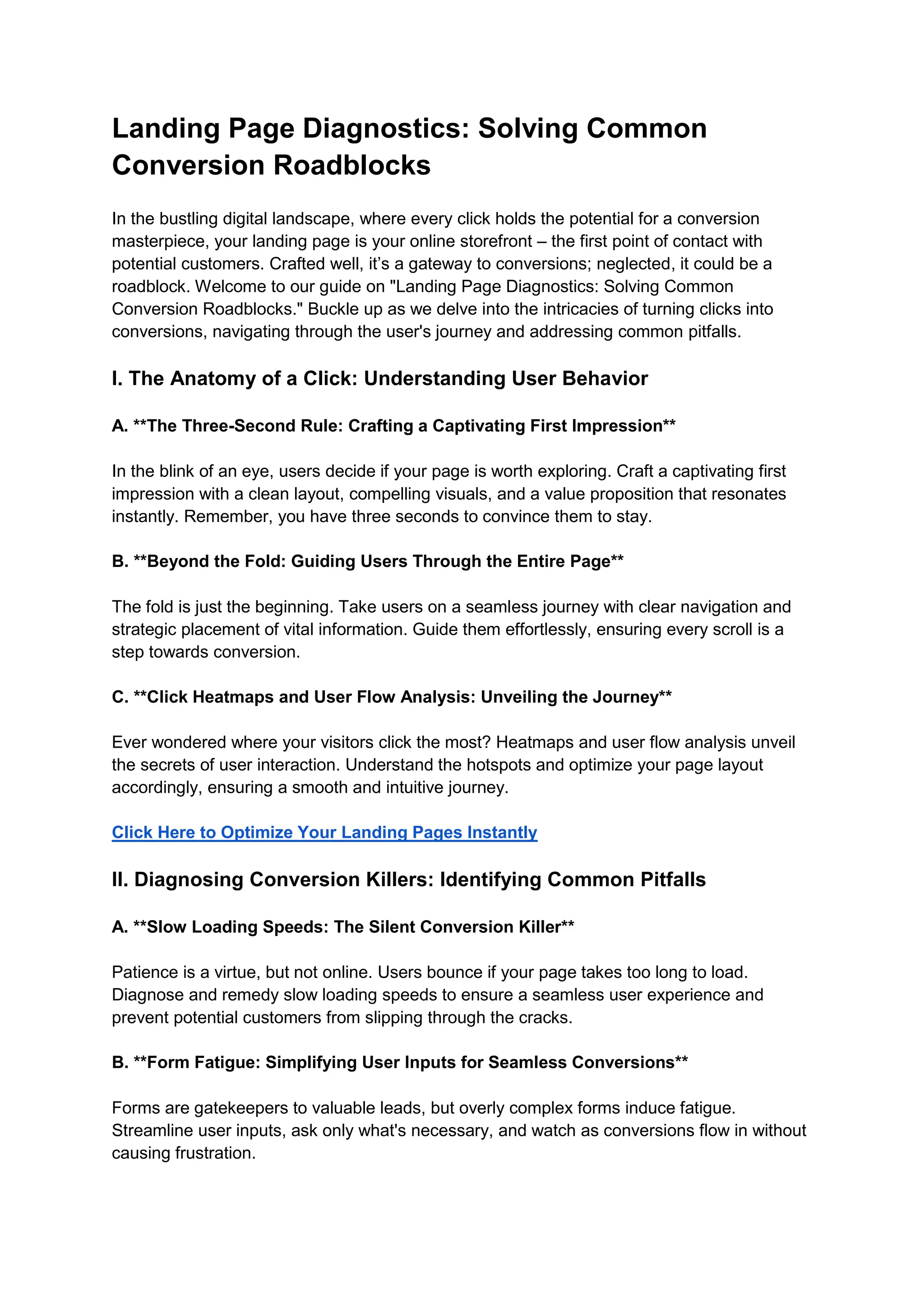 The guide focuses on improving landing page conversions by identifying common roadblocks and providing strategies for optimization. Key areas include understanding user behavior, diagnosing conversion killers, crafting compelling content, enhancing visual appeal, utilizing A/B testing, and building trust through social proof. It emphasizes the importance of the post-conversion experience and offers expert insights and resources for continuous improvement.