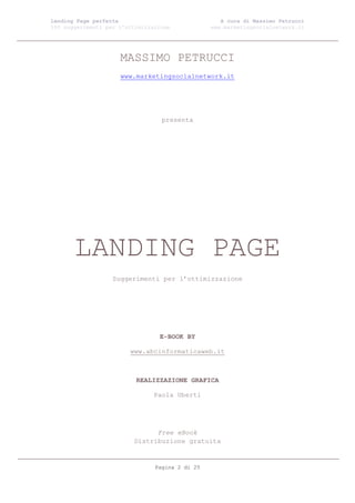 Il documento offre 100 suggerimenti per l'ottimizzazione delle landing page, con l'obiettivo di migliorare la conversione degli utenti in vendite o iscrizioni. È suddiviso in 14 capitoli che trattano argomenti essenziali come la fiducia, la SEO, la call to action e l'importanza di segmentare il traffico. Scritto da Massimo Petrucci, il testo si propone come una guida pratica per chi desidera migliorare l'efficacia delle proprie landing page.