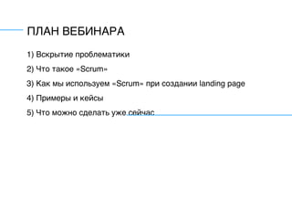 Документ представляет собой план вебинара о создании landing page по методологии «scrum», освещая ключевые проблемы и решения в этой области. Автор с опытом работы более 5 лет в бизнесе делится методами повышения эффективности и качества разработки лендингов. Вебинар включает обсуждение процесса разработки, технологии и стратегии, позволяющие экономить время и бюджет.
