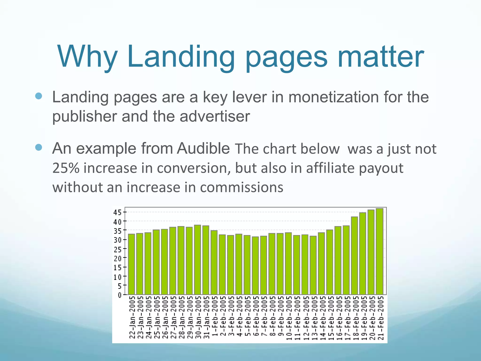 Landing pages are important for monetization and require testing. Testing elements like headlines, calls-to-action, buttons, and page clutter can significantly impact conversion rates. Examples show redesigned pages increased conversions by 25% for Audible and 89.7% for uShip simply by reducing clutter. Testing different pages for desktop vs. mobile or branded vs. non-branded keywords can also yield gains of 5-8%. Magnify360 testing found version A worked better for Mac users before 11am with a 17% lift, while version B worked better for mid-week PC users with a 22% boost. Simple A/B testing provides a way to improve pages without complicated setup.
