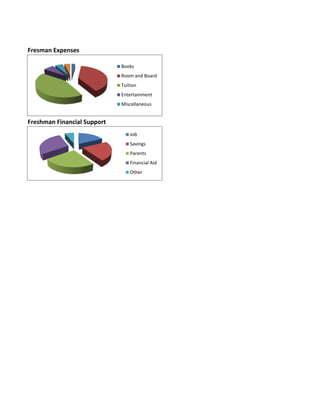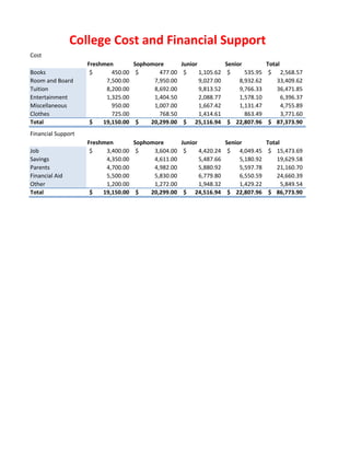 The document outlines the estimated costs for a 4-year college education including books, room and board, tuition, entertainment, clothes, and miscellaneous expenses totaling over $87,000. It also lists the estimated financial support from jobs, savings, parents, financial aid, and other sources totaling over $86,000 to cover costs each year.