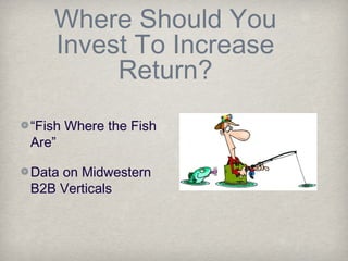 Web 3.0 is taking principles from community-focused Web 2.0 and applying them in business-to-business contexts. Data shows strong returns for investments in Midwestern business verticals like healthcare, financial services, and engineering. However, there are challenges like a lack of follow-on funding and concentration of funds in certain areas. Growing deal flow and ensuring investment success requires activities like mentoring startups, networking, and cultivating relationships with potential acquisition partners.