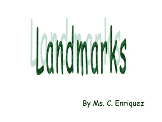 This document provides examples of famous landmarks from around the world and brief descriptions of each. It discusses landmarks such as the Eiffel Tower in France, Big Ben in England, the Colosseum in Italy, the Statue of Liberty in the USA, the Pyramids in Egypt, the Parthenon in Greece, the Great Wall in China, the Opera House in Australia, and the Taj Mahal in India. For each landmark, it identifies what it is and the country where it is located.