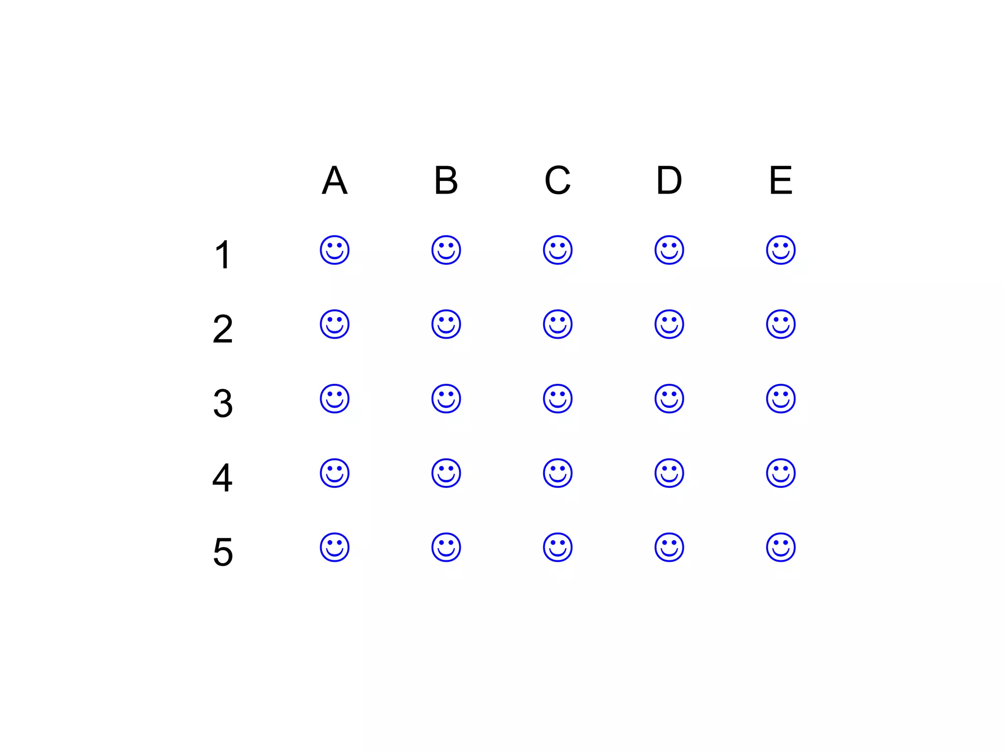 The document is a 5x5 grid with smiley faces in each cell. Below the grid are rows labeled with cell coordinates and the word "back", indicating all cells link back to themselves.