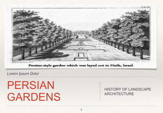 The document discusses the history and evolution of Persian gardens, detailing their significance as representations of paradise in Iranian culture and their design elements such as geometry, water features, and pavilions. It explains the influence of climate on garden design, the role of natural elements like water, shade, and sunlight, and the historical context of Persian gardens from ancient times to modernity. Additionally, it covers the variety of garden styles and the principles of design that focus on symmetry, centrality, and harmony in creating a tranquil space.