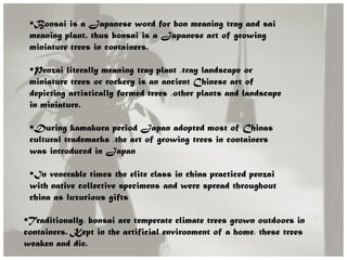 Bonsai is the Japanese art of growing miniature trees in trays, rooted in the ancient Chinese practice called penzai. Traditionally, bonsai are temperate climate trees that require outdoor growth conditions, though tropical varieties can be grown indoors under specific conditions. The art involves various techniques for maintaining tree health and aesthetics, with different styles providing visual and structural frameworks for cultivation.