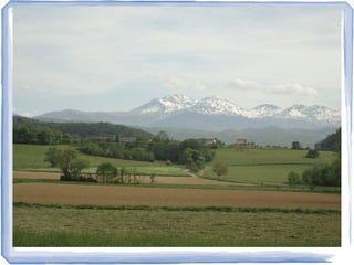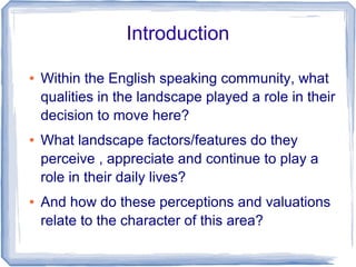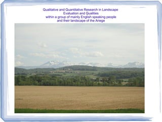The document discusses qualitative and quantitative research on how a group of English speakers value the landscape of Ariege, France where they live. It examines what landscape factors influenced their decision to move there and continue to be important in their daily lives. Interviews found that the rural scenery with mountains was a key draw, and residents appreciate the landscape's unity, history, naturalness and sensory qualities. The landscape plays an important role in their lifestyle after retiring and seeking leisure and creative pursuits.