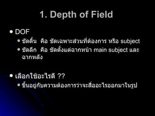 1. Depthof Field DOF ชัดตื้น คือ ชัดเฉพาะส่วนที่ต้องการ หรือ subject ชัดลึก คือ ชัดตั้งแต่ฉากหน้า main subject และ ฉากหลัง เลือกใช้อะไรดี ?? ขึ้นอยู่กับความต้องการว่าจะสื่ออะไรออกมาในรูป - 3.