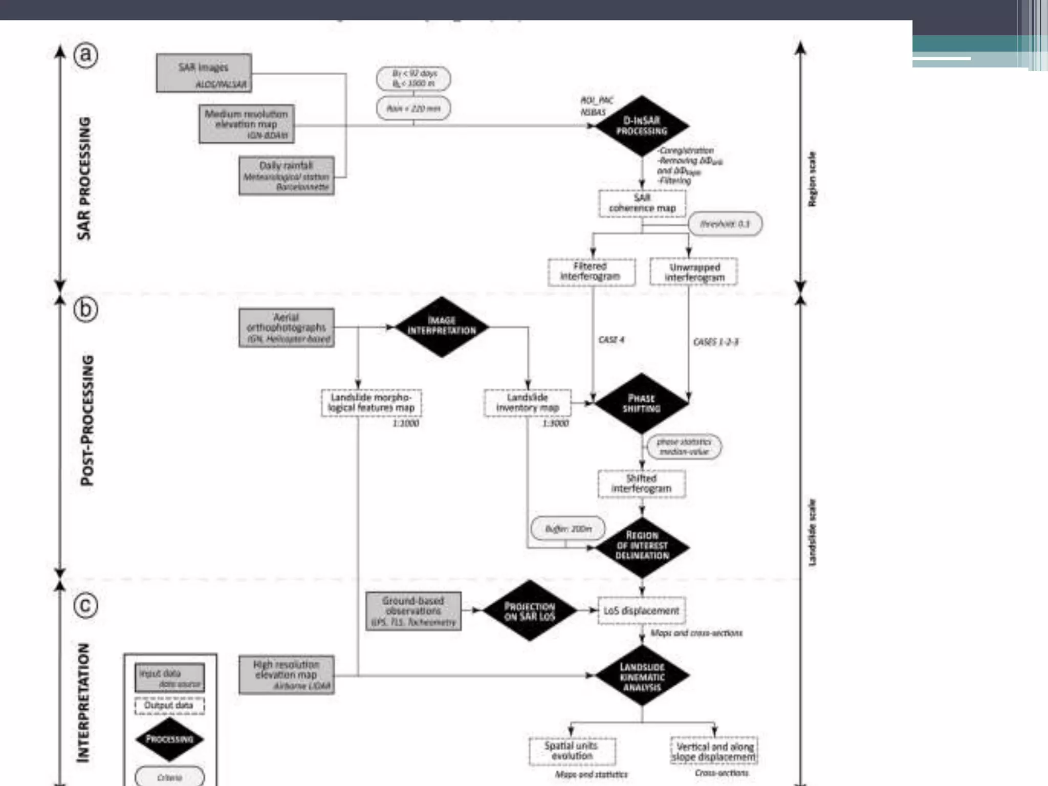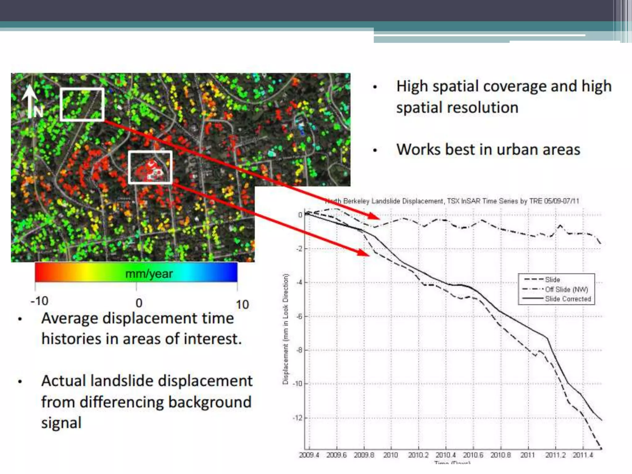 This document discusses various techniques for monitoring landslides, including remote sensing, photogrammetry, ground-based surveying, GPS, and geotechnical methods. Remote sensing techniques discussed include synthetic aperture radar (SAR), interferometric SAR (InSAR), and RADAR systems which use radio waves to detect ground movement. Photogrammetry allows interpretation of aerial photos to identify landslides. Ground surveying employs techniques like triangulation and leveling. GPS provides location and velocity data through satellite signals. Geotechnical sensors monitor deformation underground through extensometers, inclinometers, piezometers, and other instruments.