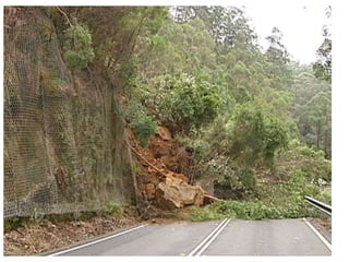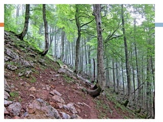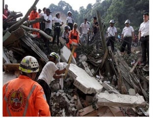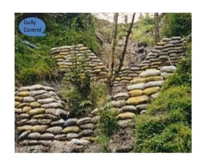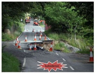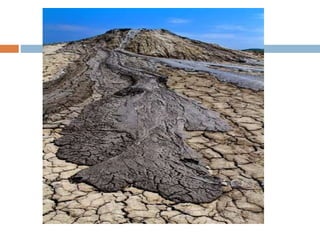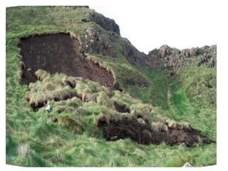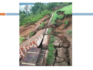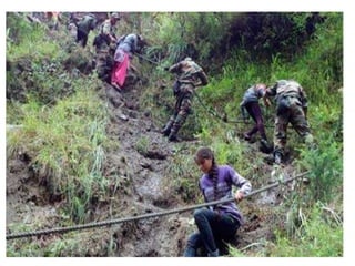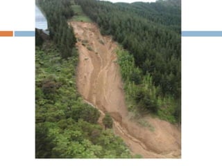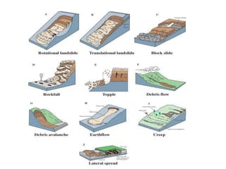 The document defines landslides as the sudden flow of rock, mud, and debris down the side of a slope. Landslides are natural hazards caused by factors like earthquakes, heavy rainfall, temperature changes, deforestation, mining, and steep slopes. There are different types of landslides classified by their movement and materials, including slides, topples, falls, and flows like debris flows and mudflows. Landslides can be deadly and cause damage by blocking roads, rivers, and damaging buildings and vegetation. Areas at high risk of landslides in India include the Himalayan region, Northeast states, and Western Ghats.