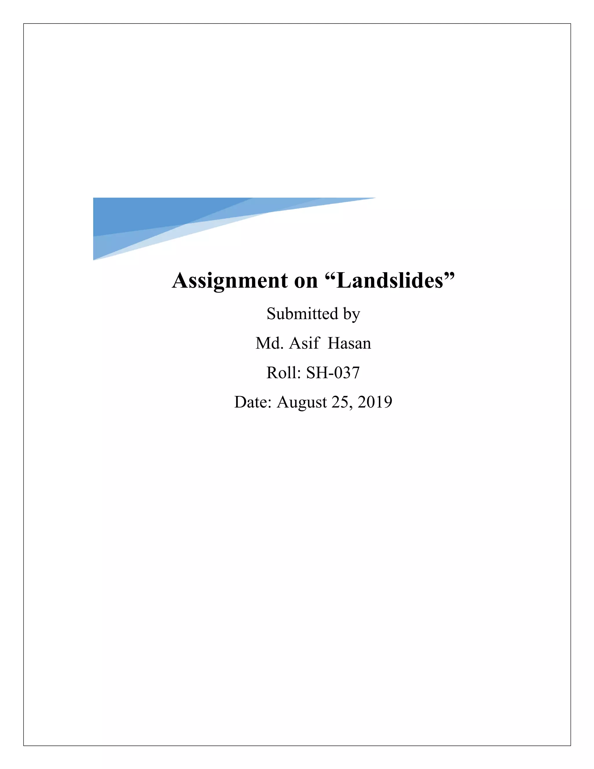 The document discusses landslides as the movement of earth, rock, and debris down slopes, detailing their causes, types, effects, and mitigation strategies. It outlines various geological, morphological, physical, and anthropogenic causes and classifies landslides based on movement rate, materials involved, and nature of movement. The document also emphasizes the importance of preventive measures, community awareness, and emergency preparedness to minimize the impact of landslides.