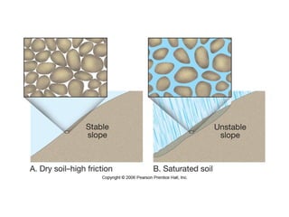 2) Factors like steep slopes, water, weak earth materials, vegetation loss, and earthquakes can all contribute to slope instability and mass movements.