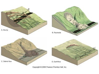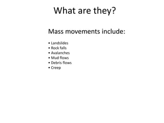 This document discusses different types of mass movements such as landslides, rock falls, avalanches, mud flows, and debris flows. It provides details on the anatomy, causes, and factors involved in various mass movements. Some key points covered include: