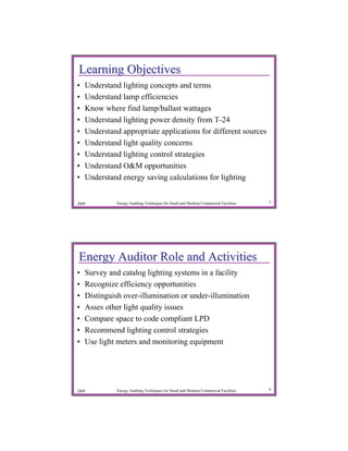This document provides an overview of energy auditing techniques for lighting systems in small commercial facilities. It discusses lighting concepts, common lighting system components, lamp types, and strategies for evaluating lighting efficiency opportunities. The goal is to help energy auditors understand lighting systems and identify areas for potential energy savings through lighting upgrades, controls, or retrofits. Key areas of focus include lighting power density, lamp efficacy and lifetime, appropriate applications of different lamp types, and control strategies.