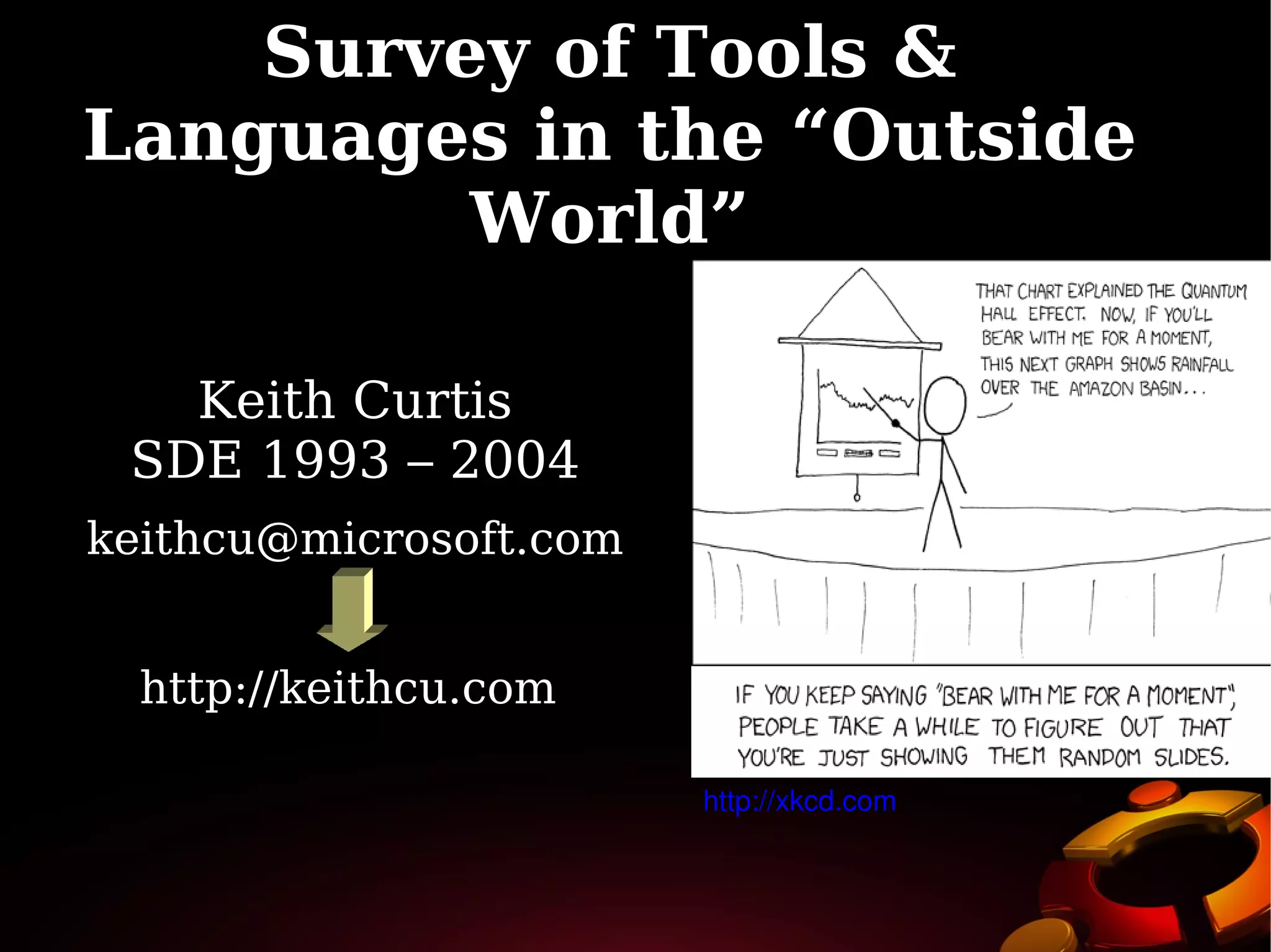 The document provides an overview of tools and languages used outside of Microsoft by Keith Curtis, a former Microsoft programmer. It discusses Curtis' experience with C# and .NET at Microsoft, and his subsequent discovery and advocacy for Linux, open source software, and free software after leaving Microsoft. Curtis summarizes his views that garbage collection is necessary for reliable code and that all non-GC code should be replaced. He also discusses Java, Mono, and the fragmented state of tools on the Linux desktop.